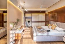 Other than common activities, the lower level also comprises of 2 bedrooms. A clean, effortlessly refined bedroom resonating with restfulness. The colour palette is kept simple with beige and ivory with wooden touch in parent’s and guest bedroom.