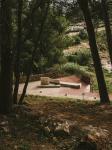 It descends and drains into a small plaza. Unlike the pathway, this space is of urban, domestic attributes. An outdoor room for meeting and rest. A fountain holds the center, expelling its water through an open drain to the natural terrain below. From its ledge of rusted mesh and stone the river can be seen, with all its white marbles, and the abandoned barns at the other side of the valley. The dry-stone wall that holds the court follows a footpath that goes down to the old wheel, coming from the high levels of the town above. Its stepped slope is solved with river stones in between salvaged bush-hammered masonry -as found in the nearby streets uphill-, combined with stairs in clay tiling, all under the shade of the pines.