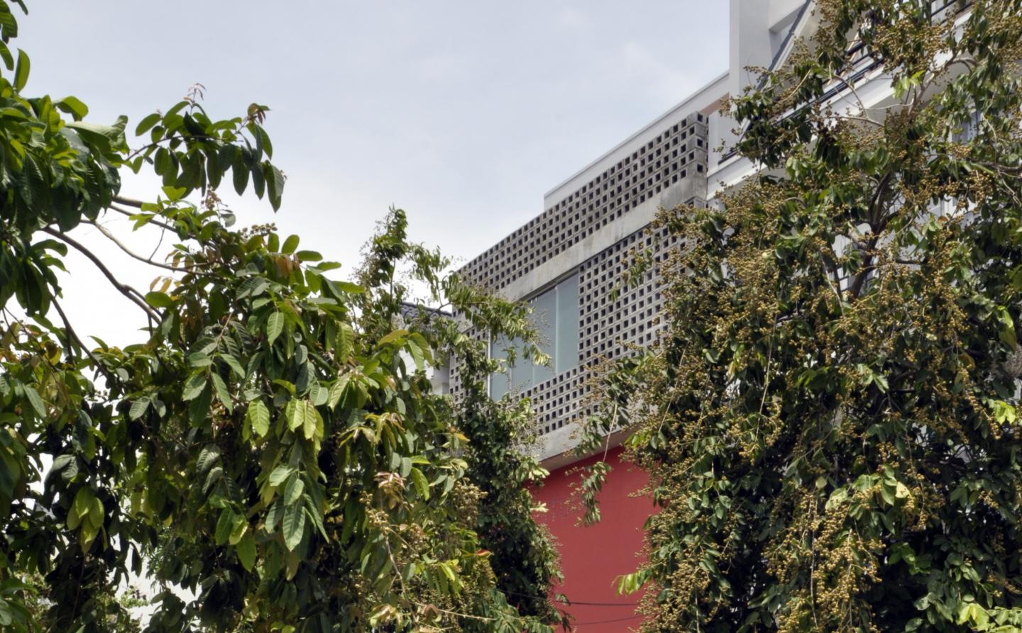 The architectural façade is consisted of three distinctive volumes: the red-painted solid gallery in contrast with the transparent glazing façade of the ground level living room, and the porous concrete block volume which contains the bedroom and studio of the eldest son. The architectural design implies the artistic lifestyle of the artists and also gives to the house a unique impression in the neighborhood.