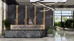 At the request of the client, the architecture of the building was made using different materials to make it look contrasting. So in the decoration were used: hinged facade of porcelain panels with a texture of concrete gray and dark gray. The canopy over the main entrance is made of metal and tempered glass. The first two floors are set aside for commercial and office space, so they have panoramic glazing. For the performance of the terraces, gray square granite panels were used, the layout was made diagonal, and panels with a rectangular wood texture and a glass fence were used.