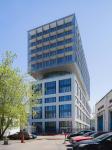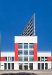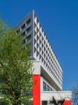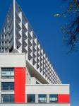 A new independent volume, with a striking, triangular cantilevered façade, now hovers above the existing historic building. The contrast between old and new is emphasized through the employment of materials: the new facade is a dramatic contemporary form, a grid of large scale modular, metallic components and stained glass, which contrasts the original grey stucco. The two volumes are separated by a public sky-garden and every room in the upper volume has a balcony or a terrace. The new structure is cantilevered from the south and north by 13 and 7.5 meters, respectively, and is supported by two V-columns. The transferred slab underneath is a waffle superstructure, providing structural stability. “The new volume on the top is designed to contrast, and at the same time, complement, the original structure” .