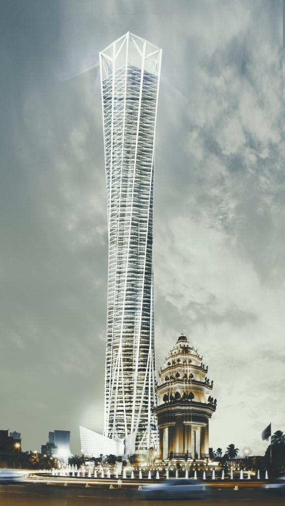 The twisting glass skyscraper – now the Country second tallest building at 450m with the Inspiration and new idea from Ochna flower and Bayon Khmer architecture. The tower’s form softly transforms the flower-shape to star-shape at the top.