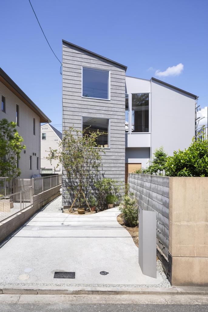 The phrase “tiny home” or “tiny lot” tends to bring to mind properties with narrow frontages. In the densely developed districts of Osaka, this type of long, narrow property is common, and houses are often built so close together a person can’t even fit between them. However, in Osaka, building coverage area (BCA) and floor-area ratio (FAR) regulations are lenient, allowing for a relatively large percentage of a given property to be built up. By contrast, in the Shukugawa district of Nishinomiya, Hyogo Prefecture (just west of Osaka), BCA is limited to 40 percent and FAR to 100 percent; height is also restricted. As a result, architectural design in this district is actually more difficult than it is in urban Osaka. In addition, on this particular lot, the residence had to be set back at least one meter from neighboring lots. This reduced the frontage on the “pole” portion of the flagpole lot to a width too small for construction, posing a further obstacle to building a home. On the other hand, we were able to locate the entire allowed floor area on the “flag” portion of the lot, which worked in our favor.