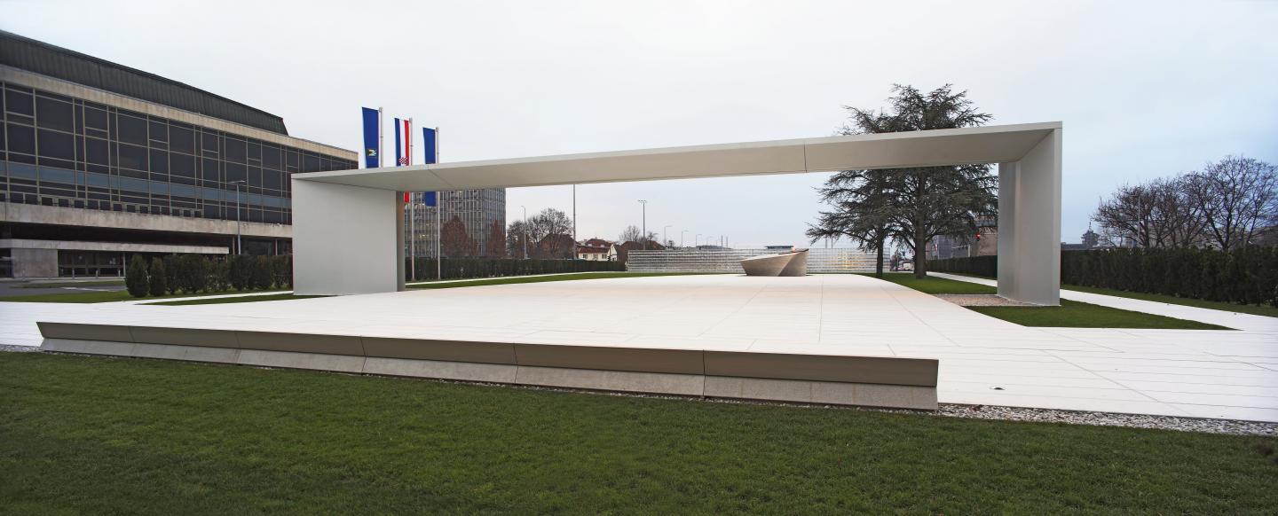 The simplified and monumental shape of the Portal is derived from the models of the historical city gates and the triumphal arch. Viewed from the south, it symbolically marks the monument area and at the same time the entrance into the initial section of the Major Axis. It can also be interpreted as the new (city) gate connecting the metropolitan center at Trnje with the old center in the Lower Town. It directly points to the new and the connection.