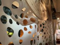 Design Results:The light shining through the innumerable perforated facade changes its expression with the passage of time, creating magnitude to the space. The holes and strings that overlap each other with multiple arcs create a gradational shadow with light transmission , giving depth to the space. The design and material helps to smoothly make the space a dynamic area , along with the subtle play of warm colors. The various strings serves as gentle partitions, providing glimpses of different angles. The choice of materials marks the project as different from the many other interior projects with its versatile and recyclable characteristics.