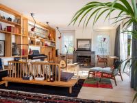 The living room is designed in two sections; one step elevated seating area to embrace the beautiful view and the garden which also hosts the traditional way of dining on sini (coffee) table ,and the music corner in front of the fireplace. The continuous bookshelf connects both spaces.