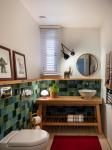 The shelving system creates a window between the seating area and the entrance hall, connecting the two spaces and bringing light to the corridor. The mosaic tiles in the entrance imitate the kilims placed all around for a pleasant feeling for the naked feet. A huge Devrim Erbil painting of Istanbul panorama takes its place in this hall.