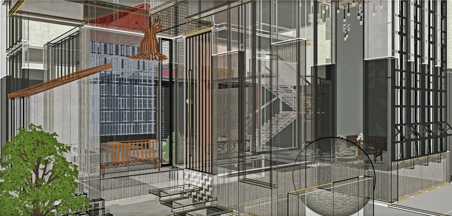 6. STAIRCASE - floating staircase is placed in the west direction which is in front of the open courtyard and double-height green space, the staircase has its own special element which connects to spaces.