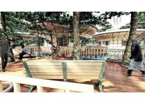 As far as the materials are concerned, the walls, false ceilings, as well as the interior and exterior circulation are made of wood. The structure is made of bamboo with a 15cm section. The foundation is floating and made of PVC drums recycled