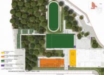 - The Auditorium (A) located to the south and the Gymnasium/Sporting Pavilion (D), with an outdoor sports field.