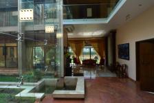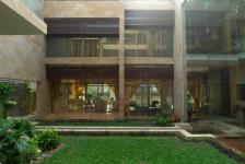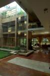 One enters into a forecourt then walks into the exterior of the house and realizes that the whole house is actively set around an internal courtyard. All the rooms open up into this courtyard and on fine weather the house becomes a continuous veranda. The courtyard is a blinded on one side from voyeurism by wall, part of which is structural and supports the hanging library. The strategic location of the library allows the lady of the house to look over the whole house. The atrium like entry is also the gallery wall to accommodate the art collection of the client.