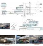 The facade and the site have different environmental solutions, based on solar analysis study. The study shows that the northern and the eastern parts of the facade receive minimum solar radiation, while the southern and western part receive solar radiation ranges from high to moderate. based on that we used different glazing system in the northern side of the building, to receive the indirect sun light. while in the eastern side we used vertical GRS movable louvers, that distract the horizontal radiation coming from the east. Double wall that helps to get rid of high temperature air and provide the building with cool air, is used in the western façade. GRC shading devise is used in the southern part for the parking area and outdoor ramp because of the high thermal mass of concrete. We have benefited from the exposed roof by placing a solar panel that reduces the need for electricity from fuel. In addition, the basement has been elevated in order to provide good ventilation and light