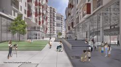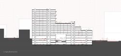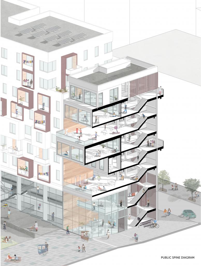 Interventions to the neighboring public space seek to enrich the vibrancy of Manhattanville by extending the project’s program and landscape. On the site, a gently-sloped central plaza responds to the current topographical conditions and blurs the boundaries of public domain. On the building scale, a series of vertical public spines provide communal amenities and incubator spaces that promote inviting exchanges and extend the tenant’s living space beyond their unit.