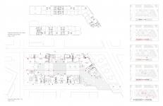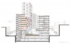 This design proposal also explores the duality between two facade systems with the face of the plaza treated differently than the exterior through materiality and form. From the cityscape, the facade will incorporate an operable screen system to allow greater privacy and shading in the balconies. In the courtyard, the facade system is more irregular with variation of protruding balconies. Inspired by the unit aggregation and massing of Via Verde, the upper levels are terraced and the market and affordable units are scattered indistinctly. There are 360 units, with 15 unit types ranging in both affordability and size to benefit all income levels and family dynamics.