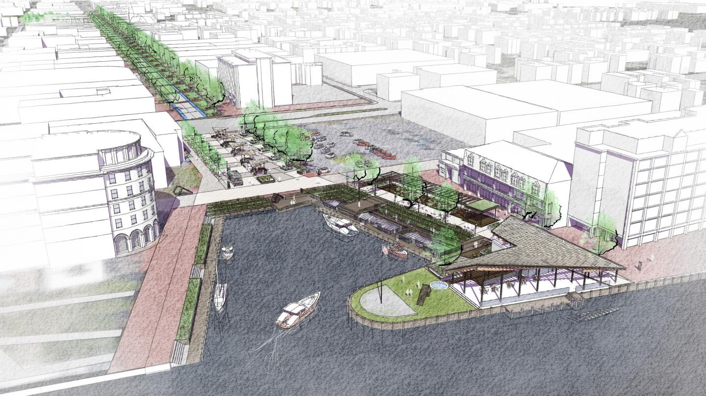 A programmatic approach was implemented that would create a connection along the existing Main St. corridor of the Downtown District. The proposed improvements would result in a reimagined High Street landing, improvements along the existing High St. Corridor, and a transformation of the currently vacant Green St. Crossing Site into a lively public park . The program of the High St. Landing site consists of a waterfront pavilion situated to provide a dramatic endpoint to the corridor, as well as a visual marker when approaching by boat. The structure of the pavilion consists of bent wood beams and joists supported on columns with a transparent membrane sheathing the roof. The wood beams and skeletal nature of the design both reference historic wooden ship building techniques. A ramp and stairs from the pavilion reach the existing waterfront terrace, upgraded with a new planter assembly with native plants to the area – acting as a filter to stormwater. New oyster beds are installed at the river’s edge to aid in filtration and cleaning of the water. A system of boardwalks extend over the water, providing protection to the oyster beds as well as a place for boats to dock. A shaded pergola, adjacent to the grand concourse, functions as an open air seating area. There is a small covered stage, and various built in planters that provide an opportunity to further activate the space . A portion of the pergola trellis extends out over the concourse and the boardwalk to create a signage opportunity that marks the plaza as the terminus of the downtown corridor.