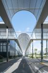The organization of exterior spaces follows the column grid of the existing building. Constructed by light weight steel system, the corridors extend alone the buildings’ parameter. By adjusting panel details of each arc prototype, it provides alternate lights and shadows for visitors when passing. At each main entrance of a building, the typical corridor units are becoming enlarged outdoor lobby space. The arc-shaped metal panels on top of each corridor unit are partly replaced with polycarbonate panels , together with customized chandeliers , to create the ceremonial spatial quality.