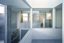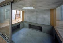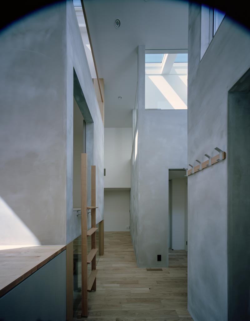 Inside, five tower-like boxes finished in cement plaster occupy the center and four corners of the structure. Light enters these towers through voids in their upper portions. The space between the towers contains the first-floor living-dining-kitchen area, which features a 4.5-meter-high ceiling. Looking up, one glimpses pieces of sky framed by the openings in the tops of the towers. Sunlight scatters off the walls, creating a living environment filled with soft light.
