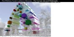 Territorial scale It is a Complex system, an INTERTWINED SYSTEM. We started thinking and idealizing about the Geomorphologic and functional conformation of LJUBLJANA trying to individuate a Genotype {a ordered city star shaped}. We started interpretating and analyzing different information given by local administration and verifying Socio-Geopolitical potentiality. Now The city looks like a modern planned city shaped like a star along longitudinal and radial corridors by alternating cords of functions. This star organizes the territory starting from the centre of the old town. Through these simple N, E, W, S, corridors, between the sections that they form, are ordered other corridors , sequentially and functionally {residential,commercial, tertiary..,industrial,green areas, cultural, educational and manufactures} .We try to combine tensions , formalizing a impure systems, a “Half-cast”, accomplice and related. A possible and metaphorical “Cenrtrifugal force” overlaps various uses of the territory putting them in relation .A multiplied and interwined system, becoming one big singularity , but formed by lots of individualities. Poljan HETEROGENITY CRITICS to the competition rules: We read the competition scheme as a classical zoning by putting different functions in different sites. We found it a bit rigid. Rather, we introduced the concept of flexiblty linking each other different functions within the Poljan territory. We planned an open and liquid system with fuzzy borders. Our aim is to accumulate density of functions getting free spaces for public uses. We see Poljan as an advanced district of services {tertiary, cultural, dwelling} immerse in a large green area, a real model of eco-friendly neighbourhood. THE RAINBOW TOWER: In the Watergate and corner city areas this system bring us to carefully mapping the zones and their possible interactions through geo-urban connectors, peatonals, infrastructures and complex “green” corridors synonymous of multidimensional fluidity. This appears to be a complex system that tries to keep in touch with every parts. An open, auto regenerating and auto recalibrating system. This system is condensed into the RAINBOW TOWER, a new magnify landmark, a symbol of the laws of nature, a living symbol, full of life in its interior and perceived from the exterior as the new hopeful skyline of Ljubljana. It is called RAIN-BOW, for different reasons: first of all, the rainbow as event driven by nature which we must learn from. Its Ephemeral, Light and Prismatic aspect reminds us to the sense of the solar energy and how is possible to take advantage of, and what kind of relation exist with sight and chromatics. Then we have The Bow, like an architectural stereotype linked to a symbolism that over the time has changed. Starting From representative, celebrative, contemplative, anti functionalist {like arcs the trionphe , obelisques} ,to a functionalist structural system; This bow has been recalled here as a new concept of condenser in terms of social, political, functional and ENERGY. It is an accumulator, a store and an attractor. In this new concept, all the old symbolism are mixed together and are turned into a new one. It is a Unique and singular Element but at the same time is horizontally and vertically multiplied.. The new concept of the tower as a container goes toward a richer concept of alive structural element which is now attractor and distributor of energy at the same time. A new eco-symbol for Slovenian democracy in which with more FRESHNESS ,it will be possible to start the holistic mechanisms , proper of the diversify and complex Contemporary era.