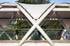 ITO Skywalk’s reticulated profile boasts of state-of-the-art facilities; its instantly recognizable silhouette feature structural, crisscross boot lace trusses that are covered with tensile fabrics. The structure incorporates steel members, with all junctions (except Supreme Court and Railway Colony Junction) being constructed in RCC and clad in red Agra stone in adherence to the context. The Supreme Court and Railway Colony junctions are conceived in the form of octagonal units with steel crowns, featuring granite flooring and S.S. glass railings. The tensile fabric roofing is an ingenious intervention, fulfilling both functional and aesthetic requirements. Concepts unique to the design are glass lifts at every junction displaying sensitivity to the needs of women and differently abled; as well as public Wi-Fi and surveillance systems for additional safety.