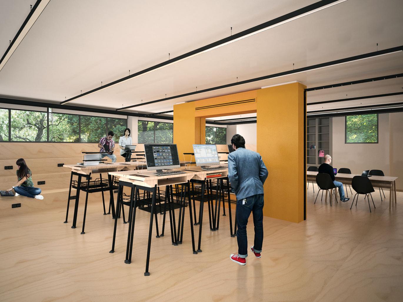 The main L-formed hall of the former computer workshop is redesigned as a convertible space that can be divided into three alternative function groups: