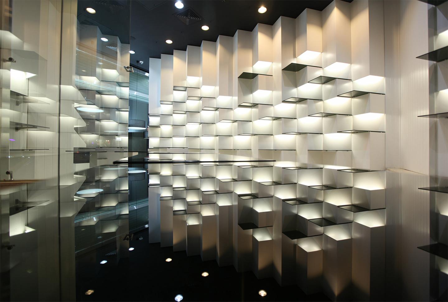 Every box was rotated around its axis at 45 degree and was attached to the walls and made the best viewing angle from the main street. By creating a vertical gentle rhythm, variation were created in the arrangement of modular forms. However these forms that was created columns triangular shape, provided a focus on the shelves by the presence inside light and their effects on those.