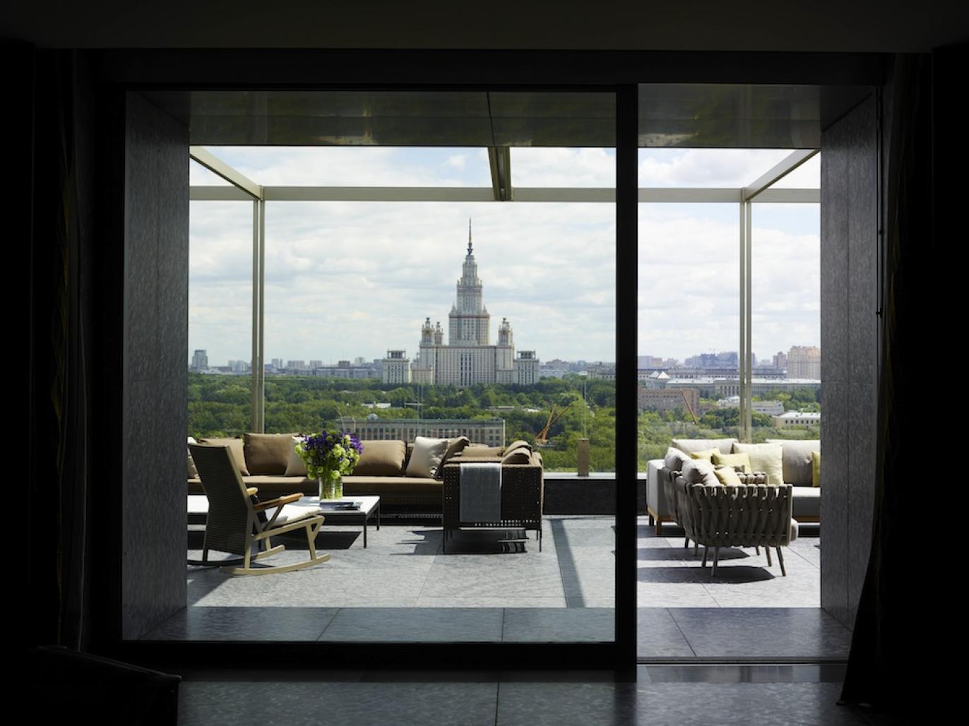 The layout of the apartment is built around a perspective axis: a symmetrical atrium leads to a bright and panoramic glass-walls lounge with the focus on the historic skyscraper of Moscow State University.
