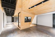 Materially the project retains an organic, natural appearance, dominated by the use of raw plywood sheets. However, the material attitude is purposefully ambiguous allowing the material to perform occasionally as soft corners or as hard edges. The material split follows the linear rupture along the main direction of the space allowing the plywood to enter a formal dialogue with the white drywall.