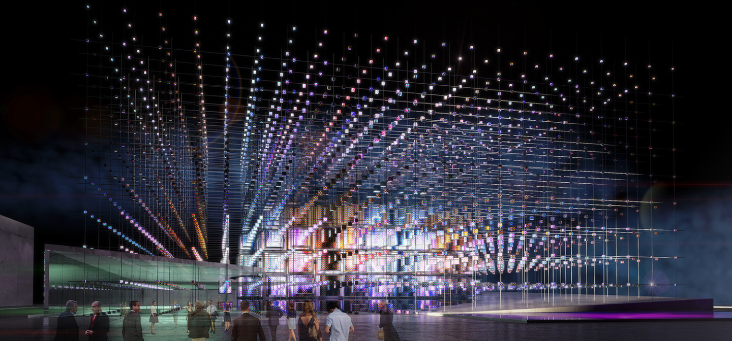 The embodiment of "Neuromatrix" - dematerialised modular shell is the main element of the concept. The fully interactive shell on the outside and inside, is programmed with the participation of visitors and Internet users.