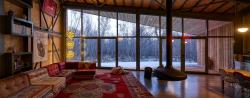 The furniture of the house has been carefully selected by the owner; the family heirloom ceiling roses are mounted above the living room area and the interior is enriched with works selected from the artist’s private collection.