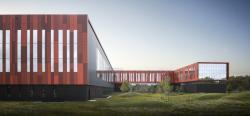 Understanding these challenges, LEO A DALY designed a renovation that unites the campus aesthetically and programmatically. The three existing buildings were reskinned with a “natural camouflage” scheme, and all on-grade parking was returned to native habitat. Stitching together the fabric of the campus, a new Z-shaped Centrum building maneuvers around two existing buildings and connects to a third through a multi-level elevated bridge. Envisioned as an employee hub, the Centrum contains a main-entry lobby, fitness facility, auditorium, and several floors of secure operational functions.