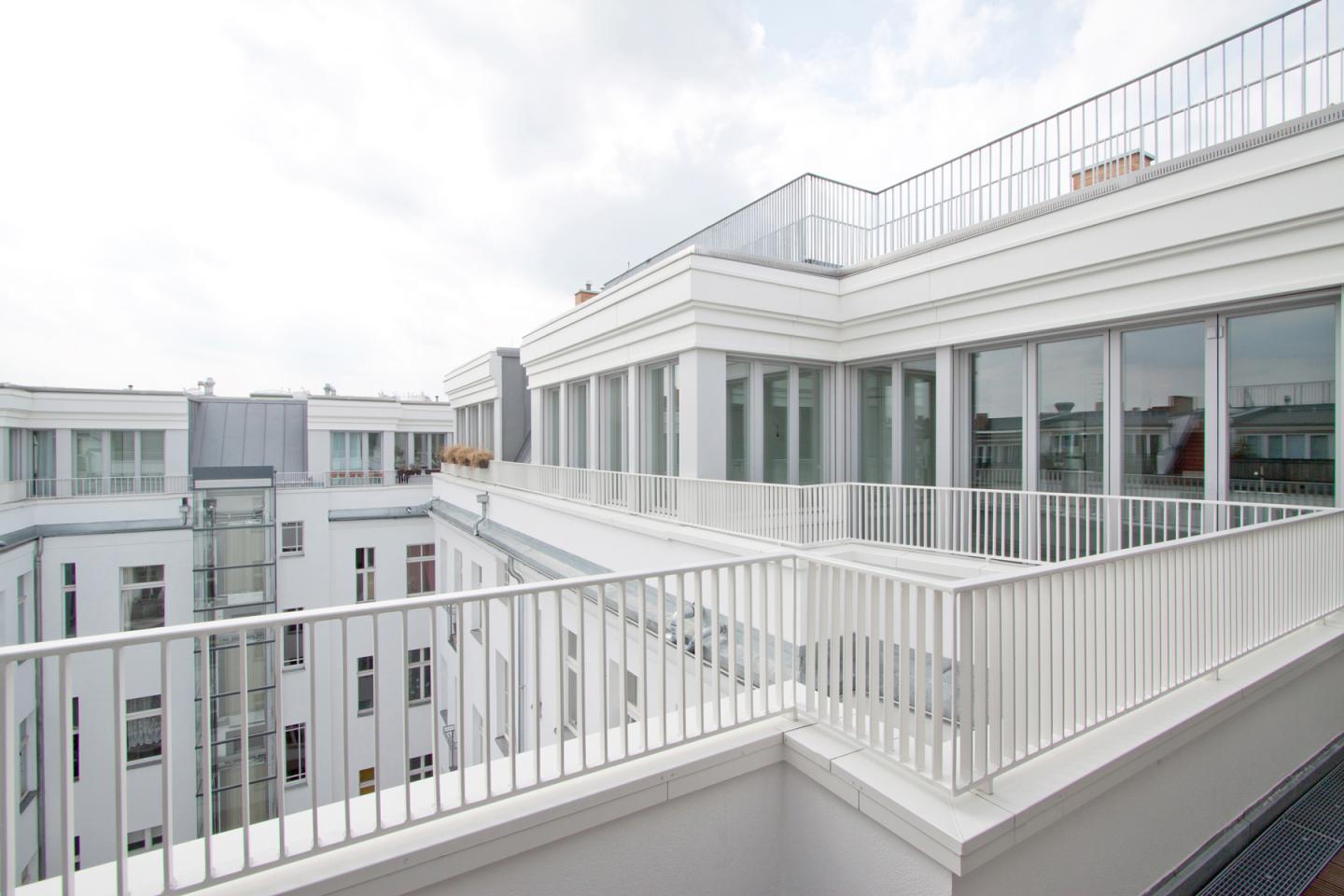 The small apartments open through new french balconies on to the courtyard.