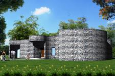 A bird’s eye view of the sprawling single-storied building resembles the silhouette of a flying bird with central body and two flapping wings on either side. The entrance lobby and lecture theatre form the central body while the temporary and permanent exhibition halls form two wings. The free-flowing form of the building together with exposed stone masonry walls helps to blend the structure well with the natural settings and organic character of the zoo. To simplify the construction process, the entire building has been provided with horizontal RCC slab with ribbed-beam structure.