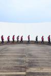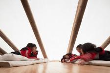 The central outdoor patio creates an enclosed platform to host learning activities and events. The white canvas ‘ring’ houses camping accommodation subdivided into segments by the three entrance points. The external corridor blends with the surrounding bamboo forest and offers an alternative circulation route while activities are happening in the central patio. The structure is elevated, keeping the ground nearly untouched. The structural A frame, a ninety-degree angled triangle, gives the design an externally pure shape, while internally the patio opens towards the sky and surroundings.