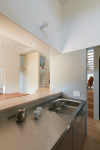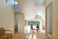 A living-dining space in a skip-floor configuration is provided at the central part of the interior space of this building.