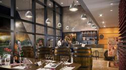 THE WINE TASTING AREA: This volume has a more robust presence and is more geared to pleasures that come with wine tasting. It enjoys natural light through an oversized fully openable window, views into the vineyard and a direct connection to the Barrel Hall and Cellar underground. Lined with slats from recycled wine barrels, the public areas evoke the rich tradition of winemaking in the region.