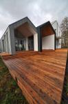 Unique single-family house is built by three independent solids that merge into one whole. Each coated / covered with a different skin, contrasting with each other. BURNED WOOD - GRAPHICS - LINEAR COARSE METAL SHEET. Three longitudinal tubes (including central one which is humped) slightly shifted, create the impression of a dynamic connection. The entire outer cladding penetrates inside with its textures and textures, cutting out 3 independent and yet interfused aesthetic-functional spaces (plasticity of external penetration into the interior is very important to us). The interior penetrates through the light that is let in, creating a view through. We see from the street the beauty of the forest lake at the foot of descending terraces of the house. Impression of empty house without walls. I would like to reside like this !