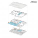 The building greets the user with a canopy supported by parametric-designed diagrid columns, which also act as luminaires for perimeter lighting. The columns are powered by PV cells on the roof. The building also embodies passive heating and cooling strategies and separate heating zones for greater power efficiency. To decrease the overall carbon footprint, stones from local quarries and local wood work with lower embedded energy are preferred in the design.