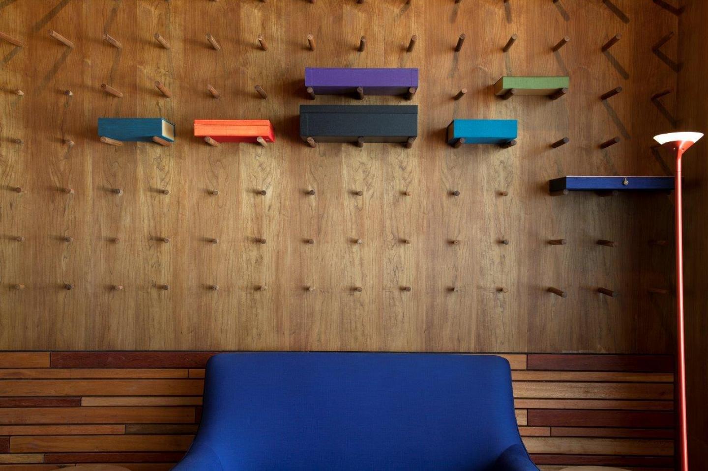 Sitting in this wooden enclosure, are a few select pieces of furniture that round off the aesthetic intervention of the project. There is a large coffee table, essentially a block of smoked maple wood with cubic subtractions and angular slots hacked into the volume, creating an abstract geometric construct where additional merchandise can be displayed. The visual mass of this table is offset by two cerulean blue Chairs with delicate pink piping on the lower edges, almost as if posing like naughty Parisian dancers. The whole composition is really just a quiet conversation between the 2 pieces of solid grounded furniture and the 2 pieces of mobile furniture.
