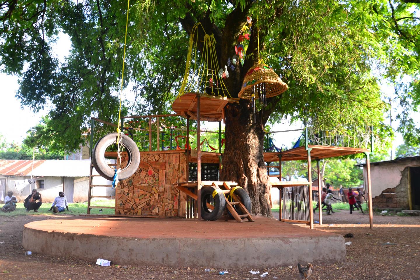 Engulfing a 90 year old tamarind tree, this 30 square meter adventure playground is made of steel and timber. Steel forms the structural framework and timber (blue gum) forming the slabs. The playground comprises of a stage as singing and dancing is a major part of the Kenyan education. It is made out of Limestone, Clay, rammed Earth and cement. Discarded rubber tubes have been upcycled by weaving them into a mesh and abandoned bicycles have been dismantled to create aesthetic elements. This was a student project which was crowdfunding and partly funded by "Architects without borders-Sweden". This project has had a huge pedagogical transformation to teaching within the school as the playground is now bein used as classrooms, thereby realizing our aim to inject playful learning into teaching.
