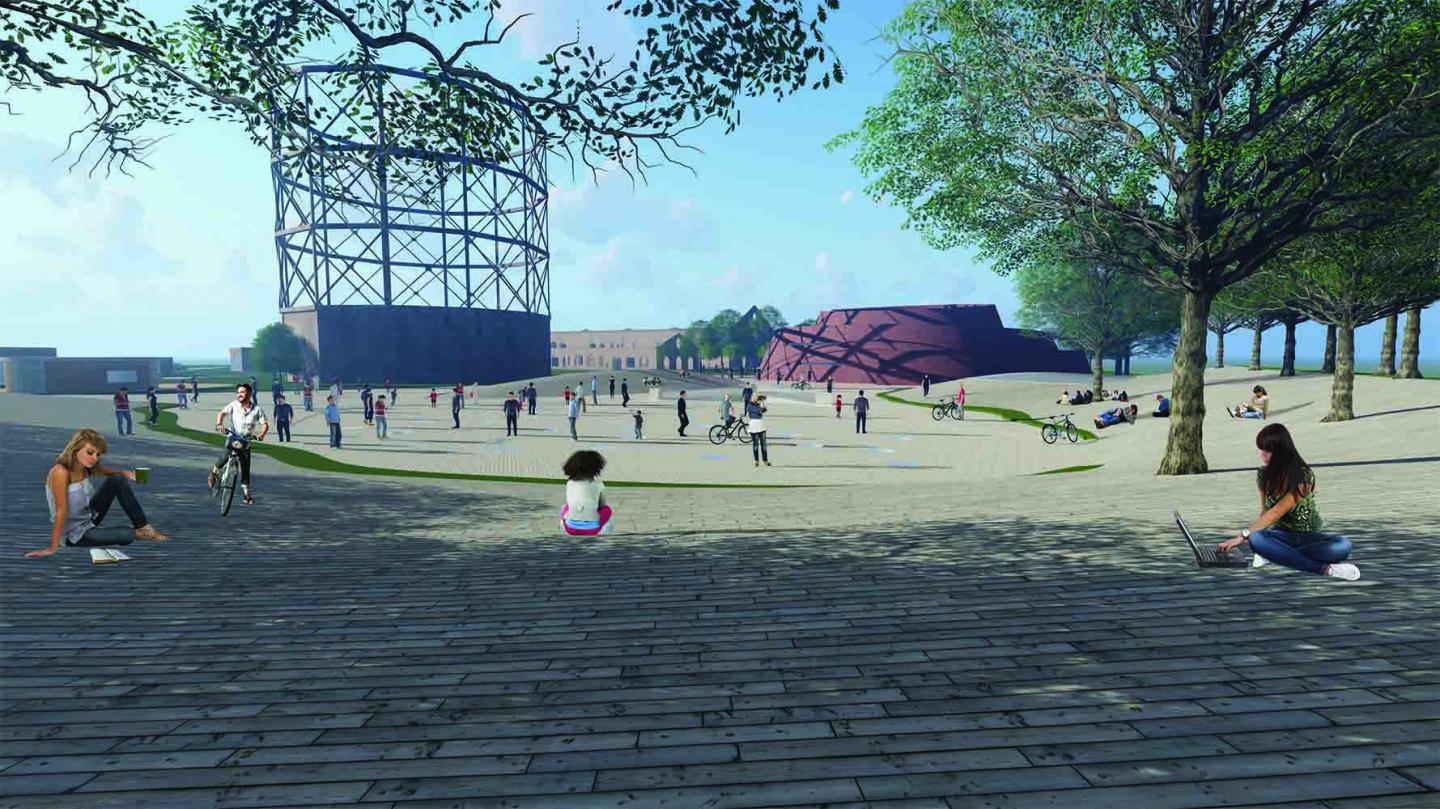 Another decision is about usage of the site. There are two old gaswork buildings and one gaswork tower. Rest of the site is empty. Our design proposal covers all the site. We prepare an architectural program to come true this idea. We divide the program into four parts that are main museum building, education areas, studios and open air spaces. Main museum building includes entrance spaces, administration units, exhibition spaces, a storage and services. Education part obtains a theater, a library, multipurpose spaces, studios and an achieve. Studios has model making studios and cafes. Open air part includes open air exhibition spaces, a street activity space and a recreation space. All of these parts stay on the site separately. Most of these spaces are underground to create big public spaces on the ground level. Near the main museum buildings, we designed a square that is surrounded by sloped surfaces. It works like an amphitheater but it provides more activity options than an amphitheater. These surfaces also create very interesting spaces in exhibition areas. On the another hand we also care designing bicycle road that spread almost everywhere on the site and we restorate the old buildings and put open air exhibition spaces in there.