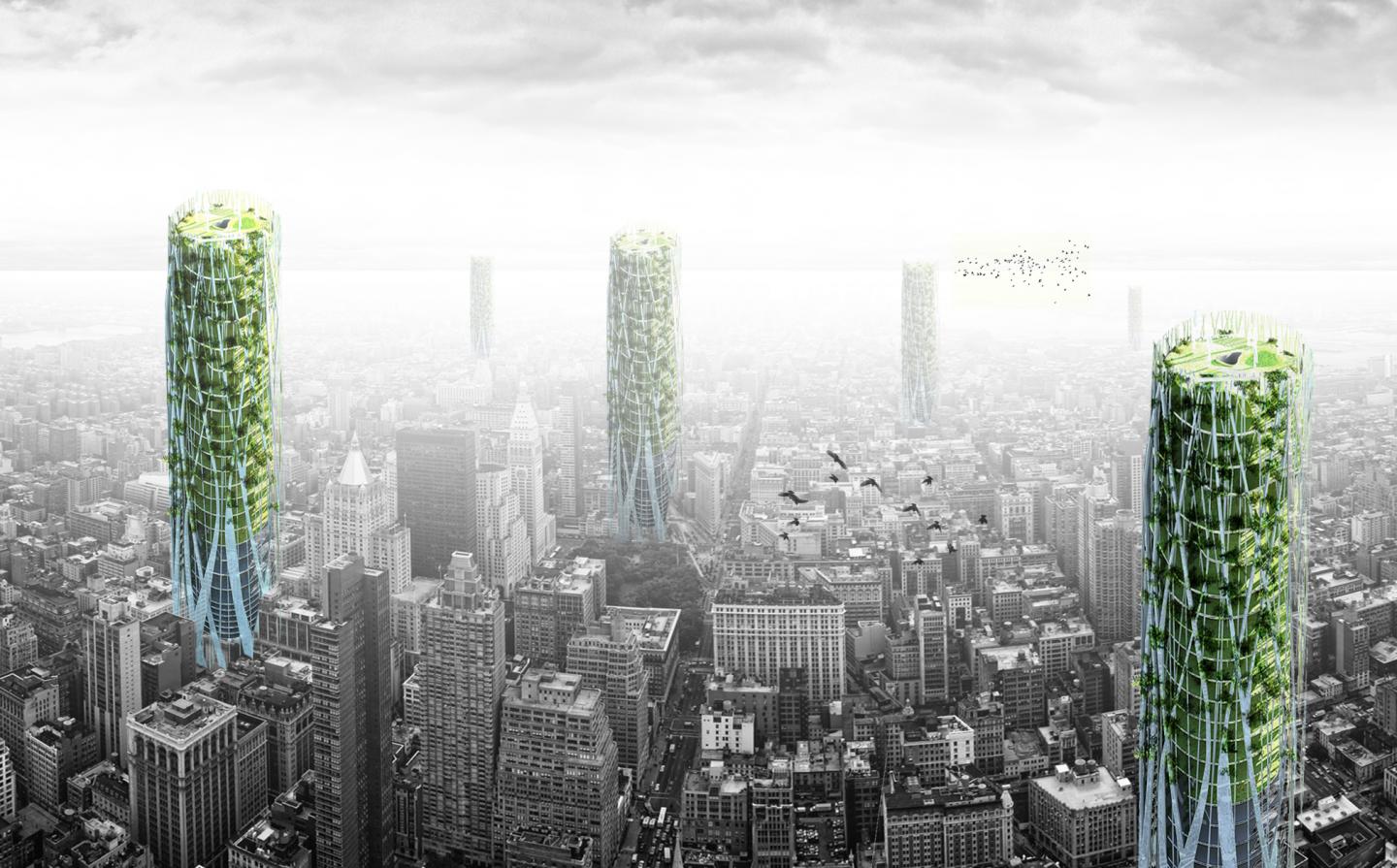 the main big structure is inspired by trees.visually , changing real tree shape into architecture concept was one of the interesting part of design for designer .In designing this project is tried to reach an appeal concept for people who would like to see the beautiful vertical city.the whole building of the city is divided into 4 main parts.the most important part is its levels that is divided into 3 parts with different height.Another part is main vertical access.the third part is pipes that has two task the first task is transfer the water and second is structural task .the last is a open spatial access. The pattern that is provided in this project is a multitask fabrication.The first task of the pattern is being an obstacle to prevent entry the dust .In some area this problem eradicate the life of people special in area that is near of desert and this pattern help people to live safety.Another task is using this pattern as photo voltaic cells .Is some areas that the sunlight is power enough for collecting can be useful for residence to use clear energy.And last but not least is using this fabrication for ventilation . Existing tiny fan in hole of fabrication can dislodge the pollution. Farming levels that is deformed to simulate the landscape and hills that is suitable for farming.A spiral road is has been provided that is open access for walking for the people who want to enjoy the views .In residence levels hills is designed for sitting like hills in nature for giving nature sense to residents. The levels height up to 10 meters for gaining appropriate sunlight .