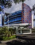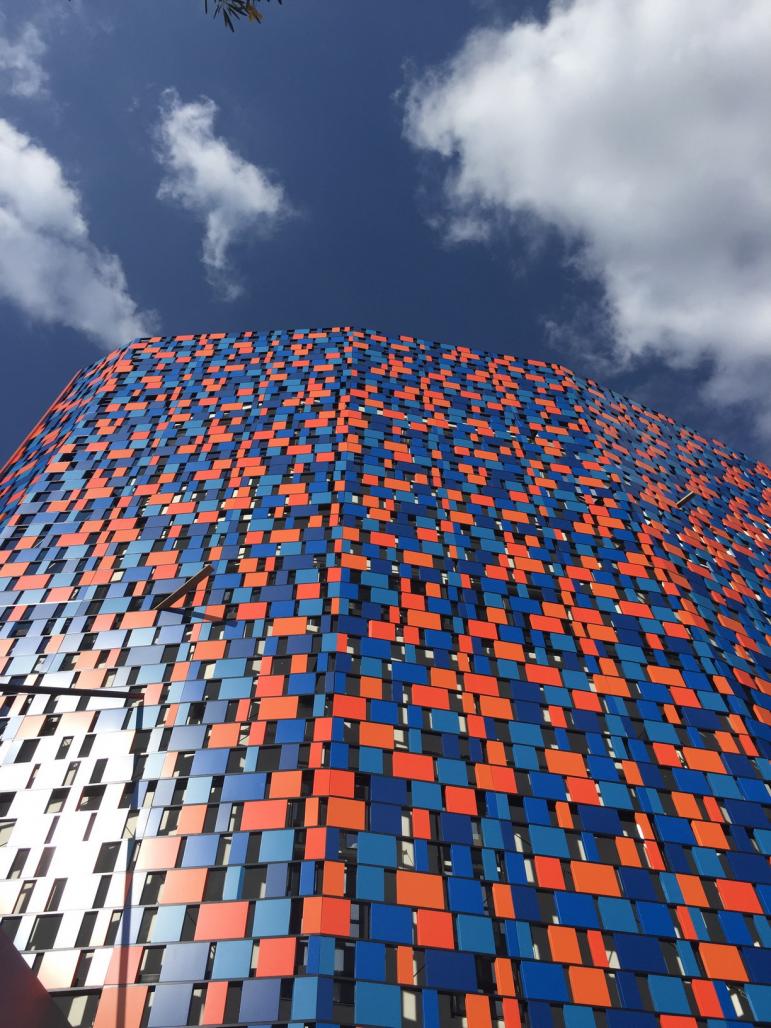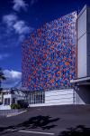 The architectural design LBIS taken to form a 5 {five} wing panel façade in the form of grating (construction steel and aluminum) as a secondary skin with 2 color logo LBIS strip of blue and orange. Five layers taken planner to be part of the concept of Pancasila Sila 5 that emphasized the value of "intercultural". This façade layers forming fins overlapping arced according longest side. Secondary aluminum skin in the form of vertical cover the entire façade field school building overlooking major street (towards the North) as a protector of visual activity learning process. While the West side to minimize exposure by using glass façade reflectif as dummy façade West and 2nd game skin in the form of random puzzle blue and orange.