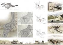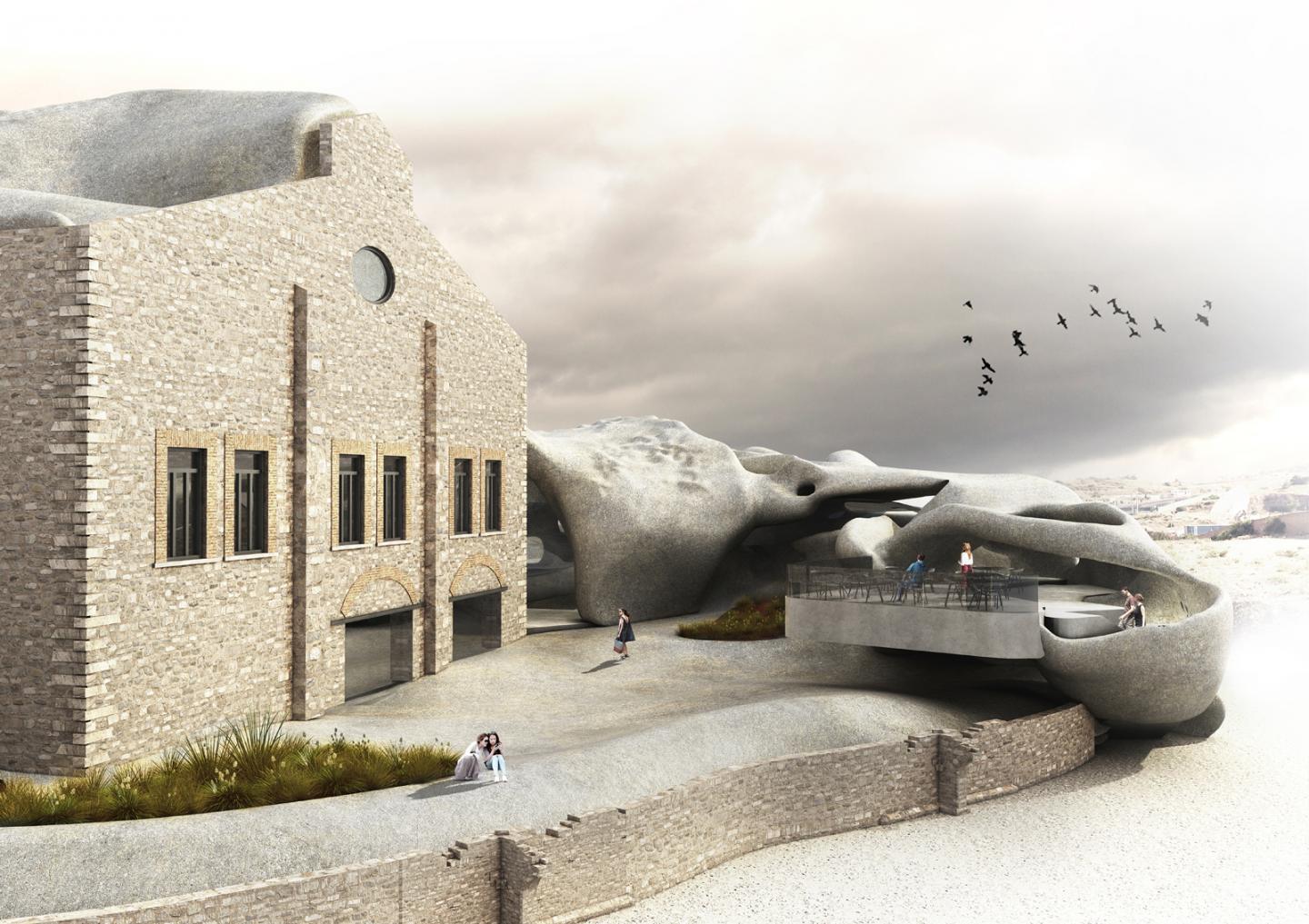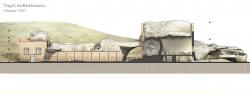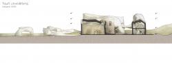 Past, Present and Future are not considered as separate spheres but rather synchronicly, attempting an experimental reuse project. We often have the impression that the past cannot survive into the present, other than as a symbolic relic of another era, resulting thus in the flattening of the architectural palimpsest. On the contrary, this projects seeks to disengage from the binary relations when managing the past. The building ceases to be a product of only one era, and work of one author, and is instead considered as an incomplete work, under constant changes caused by a number of creative agents. This symbiotic relation of old and new is turned into a design act in the old industrial complex of Arsenic in the Technologic and Cultural Park of Lavrion, in Attica. The Ancient Greeks have left us there with a legacy of metallurgic remnants, with a high density in heavy metals that are hazardous for the health. These consisted a rather ready-to-process stock for further exploitation in later years, when along came the necessary technological know-how. The industrial complex, as it has always done throughout its history, revives once again through the possibilities of its vary same matter. More specifically, we suggest that the metallurgic remnants should be rendered safe through the chemical processes of Solidification & Vitrification, in order to decontaminate the site, and then to be further processed in this new life cycle as building material, so that it constructs the sites history anew and completes the ruined walls of the industrial site. The suggested use is thus a Material Centre, with research labs and -pilot scale- industrial production, material library and exhibition space, with supporting facilities. As key inspirational triggers of the architectural synthesis functioned the following: a) the ruinous condition of the industrial site is considered its authentic one, and no attempts are made to restore it to any previous condition b)the plasticity of the relief (funnel-shaped) and c) the privacy gradients that its use imposes (visitor, staff and industrial zones). The new volume additions function as a mediator between the plasticity of the relief and the harsh lines of the industrial buildings. A digital liquid simulation tool was used to provide us with a starting raw material with these characteristics, which we later sculpted with further sensitivity to its surroundings. The liquid is poured from emitters moving along flows (see diagram) in a mold, that in no way consistutes the negative of the forms, but rather -as a topography- allows only indirect control over them. Finally, with a gesture of inversion, the core of the New is formed exactly where the Old turned its back, leaving a rather indifferent residual space.