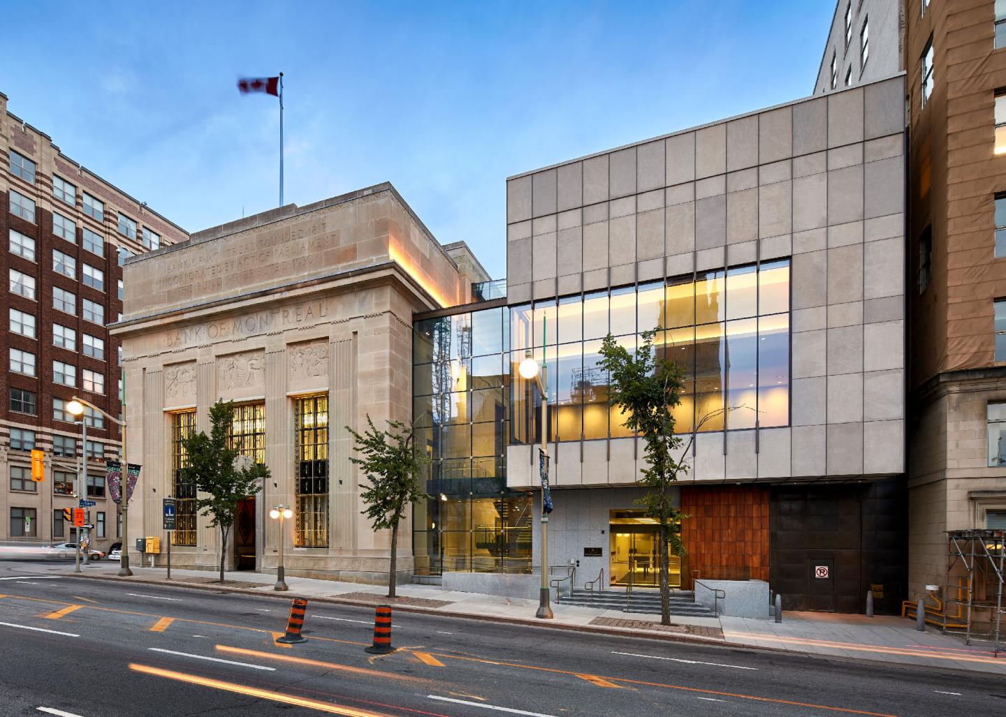 The design while respecting the quality and importance of the existing building, leverages its qualities in the service of this new use. The unused and dilapidated former bank is restored to its original glory and a contemporary addition fills the adjacent empty lot. This addition fills a longstanding gap in the continuous city streetscape of downtown Ottawa that serves as a foil to the more picturesque gothic objects in a park arrangement of the parliament buildings across the street to the north.