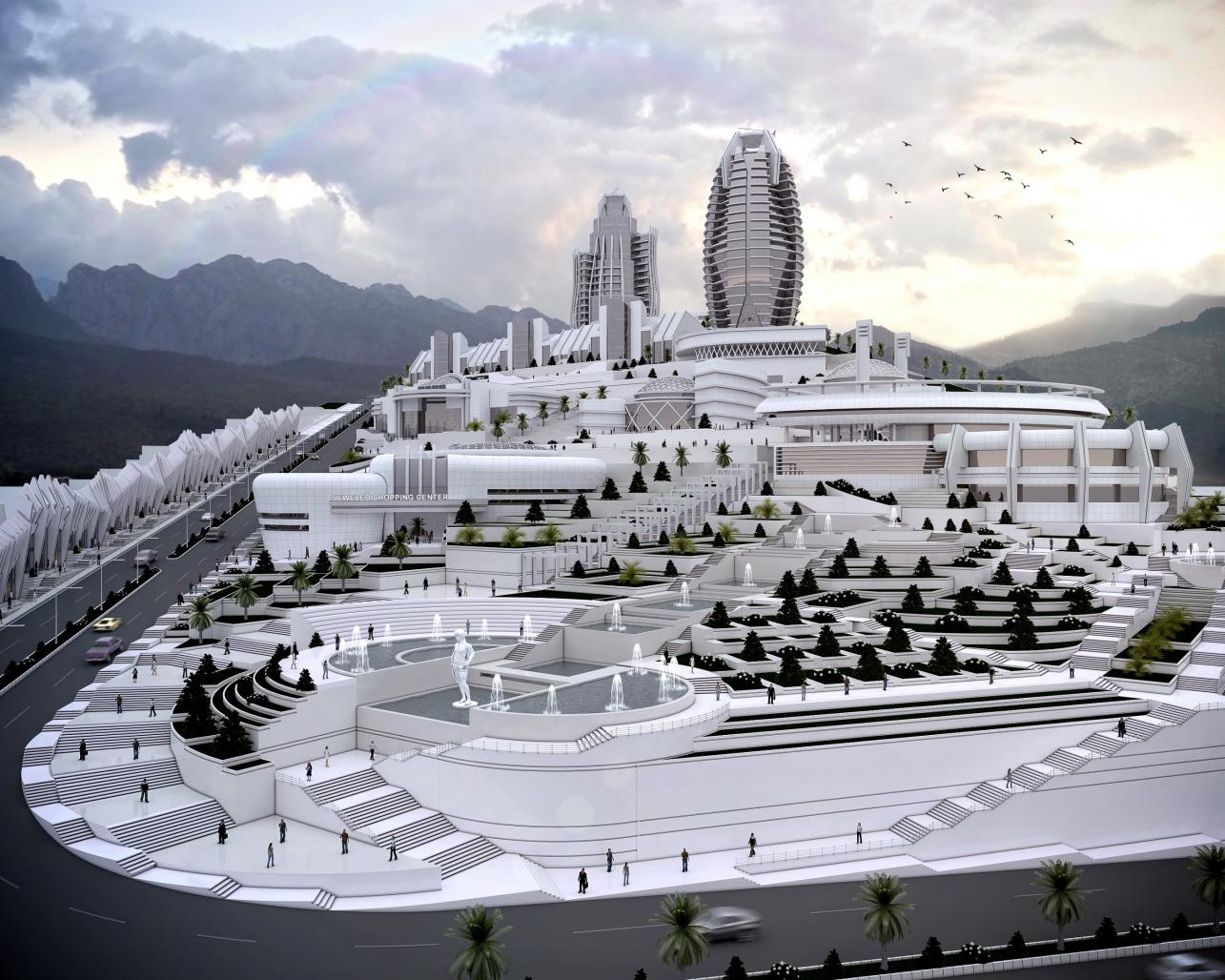 The complex has a workshop, a business complex, a five star hotel, a Reception Hall, a restaurant, a museum, residential suites, an office tower, educational centers, therapeutic laboratories, exhibition spaces, service centers, mosques, banks and other recreational and tourism facilities.
