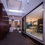 The work of architecture and interior of residential buildings should not be as short as meeting the needs of space by its inhabitants, but can provide a very specific touch to provide its own identity. The home design can appear characterized as an expression of its own from the architect and its owner through a design solution that can present an unusual atmosphere, so it can be different and out of the existing typology. The modern home-trophy model of W_house is built in a touch of modern tropical style on 510 m2 of land in the North Jakarta residential area. The 31/2 floor design of this house focuses on grouping the zones by bringing out open cores in the center to provide free space for skylights and air circulation. Zonaterbuka this will be the center point of a pathway that connects the entrance zone to the pool at the rear. Entering the house is faced with a "surprise" tropical atmosphere in the form of shadow lines that adorn the white walls and wood panels are grounded ponds and pondrenang.Cahaya who bounce from the effects of water ripples to give their own touch. Spatial arrangement in this house begins by organizing the space-space needed to produce a systematic and efficient spatial design.The lower floor is intended as a service area.Meanwhile, to reach the main floor of the house, there are staircases with stone as a floor coating and walls are arranged vertically. Entering the Main Door, there is a room with view reflecting pool at the middle of the building so that the atmosphere is cool. In the living room there is anaktangga again to go to the main room of the dwelling. In this area, the corridor separates the main room from the guest bedroom. Skylights above the corridor are aligned with the path of the sun to make the house stay bright and never ad spot spot area. Passive Techniques serve as the premise of building technical thinking to optimize natural light and especially the wind circulation by opening this central space as a space of light and flow of wind circulation cooling open spaces. Open space is applied to many natural materials such as wood on the walls and ceiling, and natural stone on the floor corridor. In addition, transparent field games intended to get a broad impression without having to disappear in terms of privacy. Arrangement of space in / interior in line with modern minimalist style and artificial lighting also contributes to create the atmosphere of the desired space. The interior is designed in white and wood color, so it is more modern interior, the living room in old orange color to contrast and blend elegantly with open space interior that combines main functions such as living room, dining room and pantry area. In part of the façade jugasama. Elements of vegetation, wood and natural stone also plays a role of the character of concrete and glass that tend to be rigid so that the composition of the building fasace look more balanced. Interestingly, the existence of a childs bedroom with a terrace that is long enough and wide as if hanging (cantilever) protruding frame frame (frame / box) visible on the facade of the building. Similarly, the roof that overshadow the mass of the building also gives an expressive impression on the figure of the building as a whole. With roof cover made of asphalt (Tegola) and steel roof structure, the roof of the init house is shaped with a wide enough shade that is expected to give a unique character in its environment.
