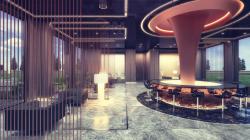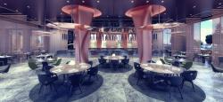 Studio Vertebra, included reflective ceiling coverings and avoided stalactite lighting elements in order to contend with the hotels floors with low altitudes. Studio Vertebra, who want to trigger excitement with an extra touch in public areas like the lobby, restaurant and foyer in addition to explicit definition of architectural lines, has gained this approach by utilizing existing load-bearing elements. They have designed load-bearing elements as sculptural forms contrasting with clear background. Thus, the aforementioned organic columns had turned into a focal point giving the impression that they are frozen at liquidness and with a diversifying perception at every angle looked.