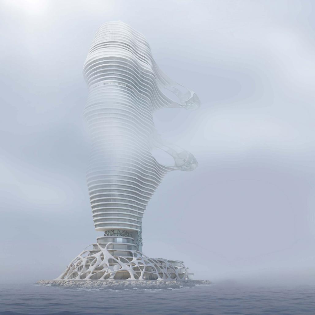 The concept "Wind Tower 2016" represents a kind of skyscraper which is shaped by tsunami and hurricane masses. The building structure itself pays homage to a wind-shaped cloud which is wrapped around a monolithic core. In terms of quantum physics, this represents the imaginary transition from water vapor to solid matter. A trapped cloud in its free form, pending in the air and only fixed by the core, still demonstrating its homogeneity (resonance) to the floating streams of air. At the same time, this could fulfills the function of an airstream catalyzer due to its materialized manner and its exterior shape in order to further strengthen the airstreams floating on its surface which are finally guided to the downwind turbines integrated in the facade end.