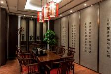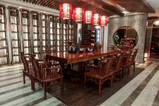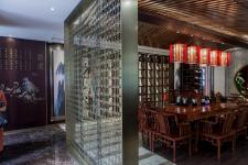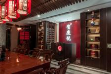 The tea house interprets the beauty of elegance through a unique new gesture. We took a natural color tone and embellished the space with strong yet graceful Chinese red, the complexity and inclusiveness of the colors provide people with unique imagination about the place. Delicate and exquisite brushed bronze and natural textured wooden walls are warm and smooth, showing an elegant atmosphere. The perfect combination of rough blue slates, neat black mirror steel and stoving varnish surfaces contributes to a simple, spacious and fine space.