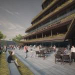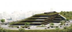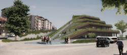 When viewed from the sky it is noticed that the green tissue cuts through building islands and reaches the shore in the east of the center of Tekirdag, a city in Thrace region of Turkey surrounded by agricultural land on the north and Marmara Sea on the south. The competition plot is located right next to this intersection where the urban meets the rural. There the sloping topography is sliced with retaining walls reaching 14m height on the northern corner of the plot, in order to create a bus station on the same level with the avenue. The thought that emerged in response to those walls bordering the green and built areas has been the starting point of the architectural design: “Eliminating the walls of the dam so that the buildings from one side and the greenery from the other mix and flow toward the street level; recreating the destroyed part of the topography with the emerging hybrid tectonic pile.”